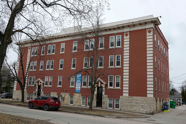 This three-storey brick and stone block on Daly Street North in Winnipeg, measuring 92 feet by 47 feet, was designed and built in 1913 by David A. Abramovitch at a cost of about $40,000. The contained 22 apartments in its original configuration.