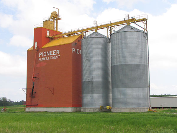 A 62,000-bushel wooden grain elevator one mile southwest of Kenville, on the CNR Preeceville Subdivision in what is now the Municipality of Swan Valley West, was built in 1959 as a crib annex at Hyas, Saskatchewan. Moved 78 kilometres to this site in February 1987, the annex was put on a new concrete foundation and a drive shed, office, and chemical shed were constructed to convert it into a fully-functional elevator for Pioneer Grain, with a 21-car spot. It was opened with a ceremonial grain delivery by a 1948 GMC truck driven by Nelson Cotton, the son of one of the early Pioneer agents at Kenville. Later, two steel tanks were constructed on its southwest side, increasing the total capacity to 118,000 bushels. The elevator was closed and demolished in October 2014.