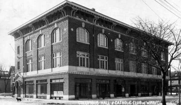 Formerly located at the southwest corner of Smith Street and Graham Avenue in Winnipeg, a four-storey brick building, measuring 70 feet by 130 feet, was designed by local architect John Danley Atchison and built in 1913 by the Frid-Lewis Company for the Knights of Columbus at a cost of about $150,000.