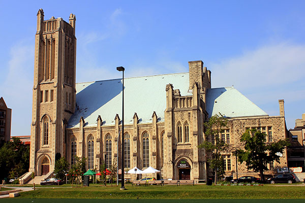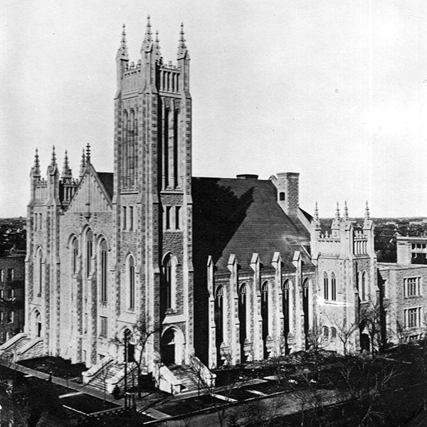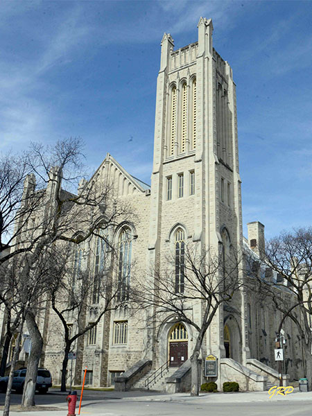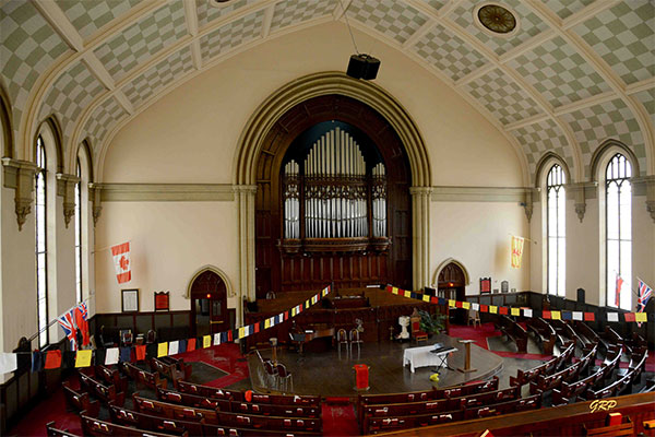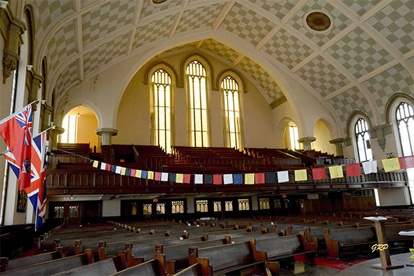 The congregation continued to grow so, between 1914 and 1918 (a period prolonged by the First World War), the present-day church was constructed at 400 Edmonton Street on a design by Winnipeg architect John Hamilton Gordon Russell. A memorial tablet to members of the congregation killed in the First World War was unveiled on 17 October 1920 by Frederic Beal DuVal, pastor emeritus of the church. DuVal’s son William was killed in the war and his name appears on the tablet.