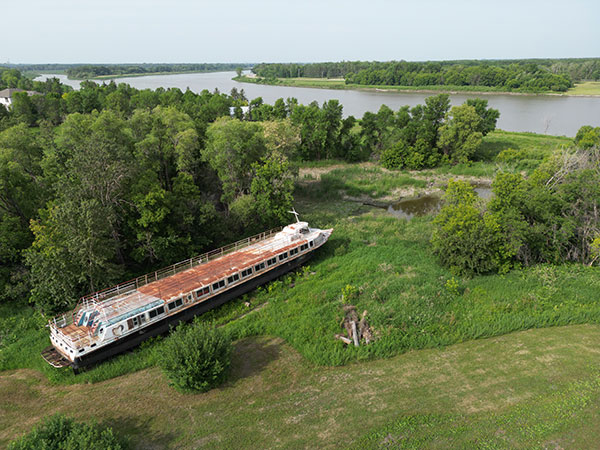 The Lady Winnipeg cruise ship was designed and constructed between 1971 and 1972 for businessman Daniel Anthony “Commodore” Ritchie. Initially 80 feet long, it was extended by 36 feet in 1974. Last operated in 1993, it was sold in 2002. Its new owner planned to use it as a private yacht. At the time of a 2023 site visit, the ship was abandoned beside the Red River in the Rural Municipality of St. Clements.