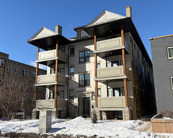 This three-storey brick and stone apartment block on Stradbrook Avenue in Winnipeg, measuring 40 feet by 110 feet, was designed by local architect George William Northwood. It was built in 1909 by the construction firm of Hinds and Mitchell at a cost of about $35,000. In its original configuration, the building contained 12 apartments plus a janitor’s suite in the basement.