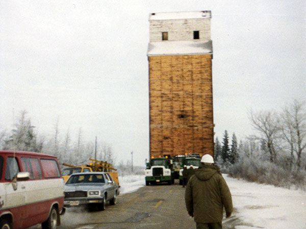 Manitoba Pool grain elevator at Langruth being moved to Westroc (late 1983)