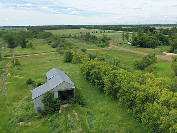 Aerial view of the former elevator driveshed and office and overgrown railway line (July 2022)