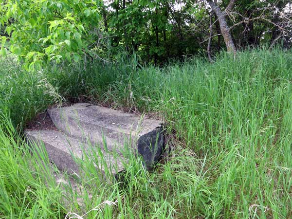 A concrete foundation of the former Leary School building at the left side of the photograph is concealed by trees (June 2013)