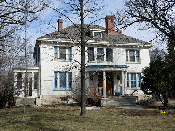 This two-storey residence in the Crescentwood area of Winnipeg was built in 1905 for John Leslie. Architectural drawings were commissioned from Montreal-based Howard Colton Stone, with construction work overseen by Stone’s local manager (and architect) Leonard Temple Bristow, and completed by contractor Robert Watson with cost quoted between of $12,000 [1905] and $25,000 [1905 & 1906]. The original exterior was of pressed red brick with interior hardwood flooding shipped in from Berlin [now Kitchener], Ontario.