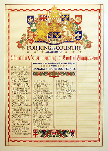 Located in the offices of the Manitoba Liquor and Lotteries Corporation (MLLC) on Buffalo Place in Winnipeg, this memorial commemorates Manitoba Liquor Control Commission (MLCC, now part of MLLC) staff who mobilized and served during the Second World War, of whom two died and one (J. A. Bailie) was taken prisoner of war. Believed to have been first located in the MLCC office headquarters at 317 McDermot Avenue, it was later relocated to the Commission’s facility on Buffalo Place. The artifact was placed into storage during renovations and later brought to a second floor office within the building. It remained in staff quarters, beyond public access, until January 2020 when custody was transferred to the Archives of Manitoba.