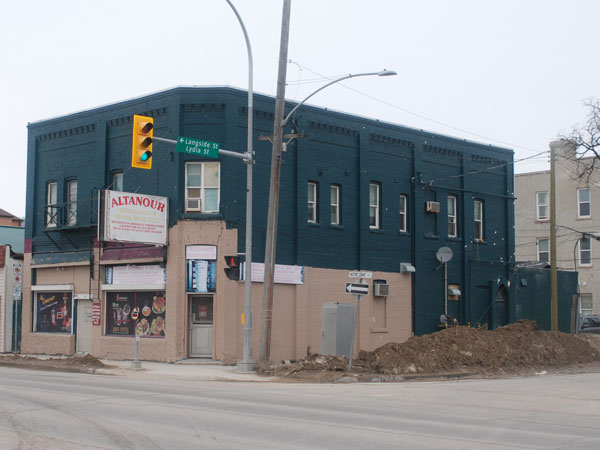 This two-storey brick block at the northwest corner of the intersection between Notre Dame Avenue and Lydia Street in Winnipeg was designed and built in 1904 by S. G. Greer for owner W. J. Greer at a cost of about $10,000. As built, it contained two stores on the ground level with a dwelling on the second floor with the residence (later apartments) being accessible from a side entrance on Lydia. In late November 1904, Greer sold the property to J. McKenzie for $15,000.