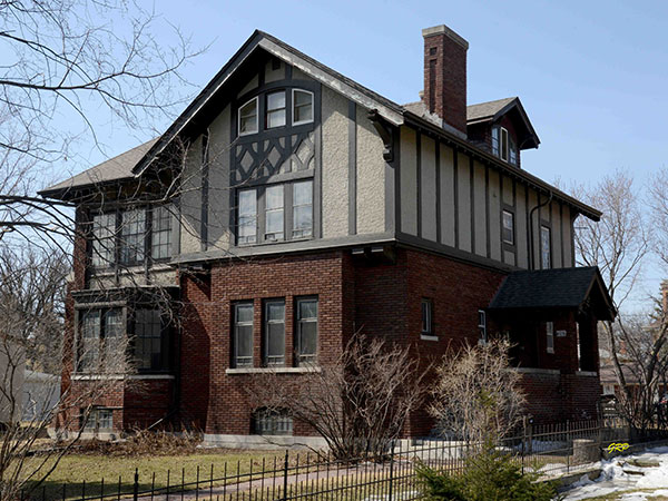 This two-storey brick house in the Crescentwood area of Winnipeg was designed by local architect John Danley Atchison and built in 1909 for Charles A. MacKenzie.