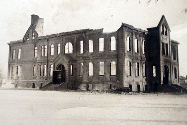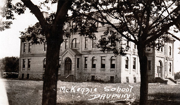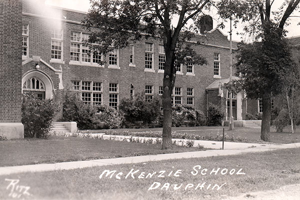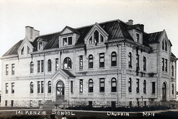 Its two-storey, twelve-classroom brick replacement was designed by local architect Joseph Henry Bossons and built later in 1909. It was named Mackenzie School, allegedly to commemorate railway builder William Mackenzie (1849-1923) who constructed the first railway to the Dauphin region. This school was destroyed by fire on 12 December 1926.