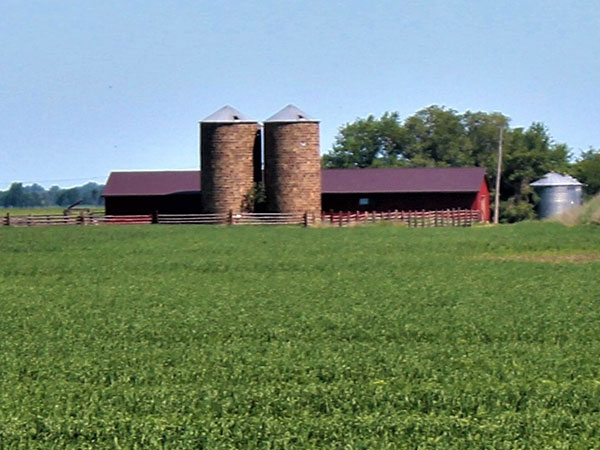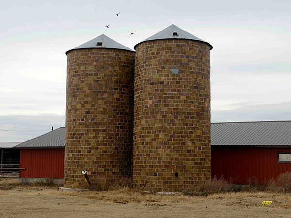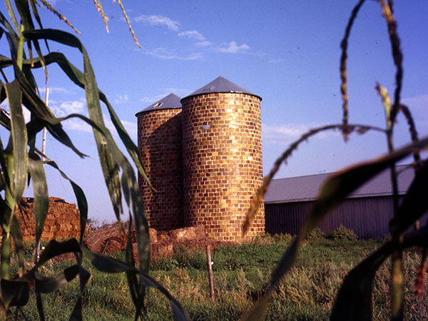 Most silos in Manitoba are made of either wood, steel, or concrete, with the latter two materials usually identified with feed towers built after the Second World War. One of the rare exceptions to this are these examples located about five miles north of Carman on Highway 13. Built 62 years ago for D. Maloney, the large tiles were imported from Ontario. The structures are 35 feet high and 15 feet in diameter, and were originally attached to a large dairy barn which has since disappeared. The silos provided corn feed to about 40 dairy cows. Today, the Matt Dawydiuk farm uses the structures for grain storage. The only change to the structurally sound silos has been the replacement of cedar roofs with new metal ones.