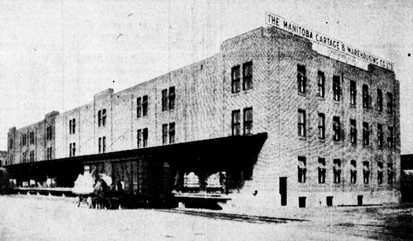 This three-storey brick warehouse on Higgins Avenue between Stanley and Lizzie streets in Winnipeg was designed by the architectural firm of Northwood and Chivers and built in 1926 for the Manitoba Cartage and Warehousing Company at a cost of about $70,000. In 1929, an addition measuring 162 feet by 87 feet was added, also designed by Northwood and Chivers and built by contractors Pain and Roe, was built at a cost of about $85,000, bringing the total size of the building to 265 feet by 87 feet.