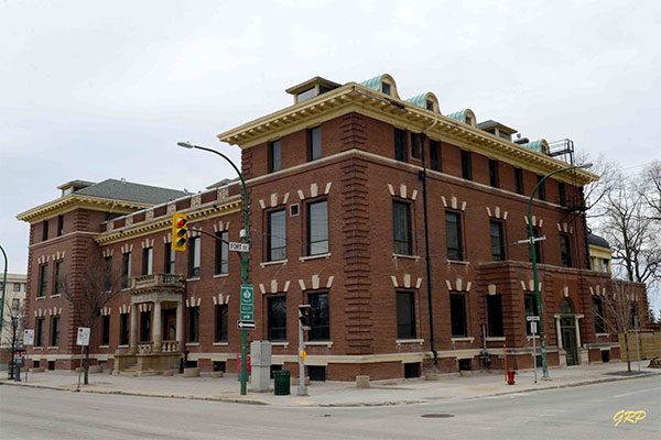 The first of its kind in western Canada, the Club operated a clubhouse on Garry Street. It contained a stained glass window, acquired during the club presidency of Hugh John Macdonald, to commemorate the diamond jubilee of Queen Victoria in 1897. The window was moved to the present two-storey brick clubhouse on Broadway, designed by local architect S. Frank Peters, in 1904. The building was opened officially on 10 October 1905. An addition in 1913 was built by contractor Aaron Grey.