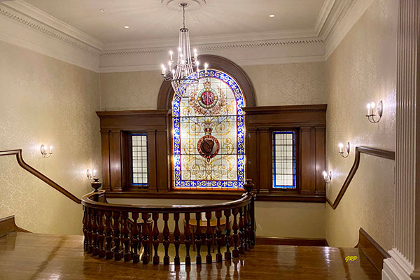 Queen Victoria diamond jubilee stained-glass window in the Manitoba Club's main staircase (February 2023)