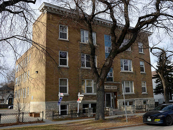 This three-storey, brick apartment block on Alverstone Street in Winnipeg, measuring 72 feet by 55 feet, was designed by local architect Peter Cornelius Samwell and constructed in 1912 by contractor John Edward Wilson at a cost of about $45,000. It contained 14 apartments in its original configuration.