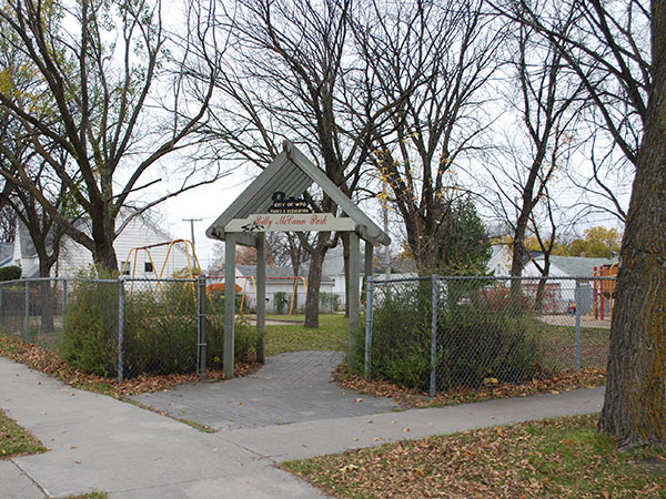 This site at the southwest corner of Rosseau Avenue at Day Street in Transcona was named for William Alexander “Billy” McCann. Born on 11 October 1921, the only son of Alexander Starret McCann (1887-1969) and Florence McCann (?-1963), he attended school in Transcona. A noted marksman, he won numerous medals at competition, was an active curler, and played with the Transcona Tigers (1940) in the Manitoba Intermediate Rugby Football League. During the Second World War, he enlisted with the Royal Canadian Air Force in January 1941 and was deployed overseas in October of the same year. While working as an Air Gunner with the 115th Squadron, he was shot down over Germany on 28 June 1942 and was killed. He was buried with full military honours at Marham Cemetery in Norfolk, United Kingdom.