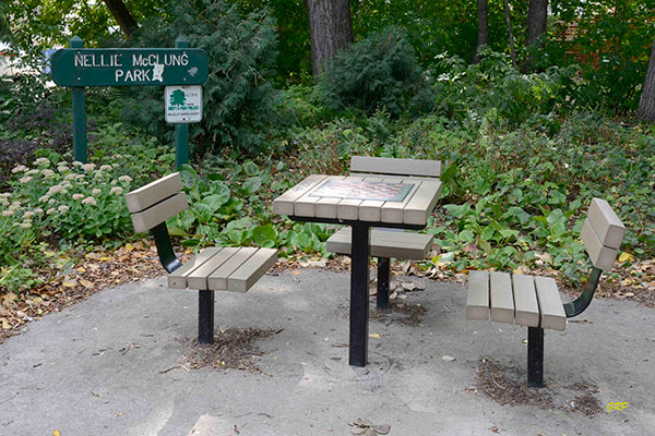 This plaque, located at the southeast corner of Wolseley Avenue and Lenore Street, recognizes the efforts of Nellie McClung in the social reform and women’s suffrage movements of the early twentieth century. The McClung House on Chestnut Street is located near this park.