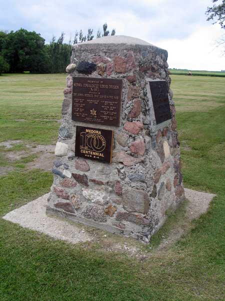 Plaques on a monument in Medora, in what is now the Municipality of Brenda-Waskada, commemorate the Canadian centennial year (1967), the Manitoba centennial year (1970), and a reunion for the Medora School (August 1991). Erected at a ceremony on 30 June 1967, it acknowledges the rural schools that were merged into Medora Consolidated School No. 493: Otter School No. 411, Purple Hill School No. 487 (1887-1959), Old Medora School No. 493 (1887-1914), Medora School No. 493 (1914-1959), Mimosa School No. 532, Menota School No. 519, Berry Hill School No. 748, and Sherwood School No. 1478 (1902-1959).