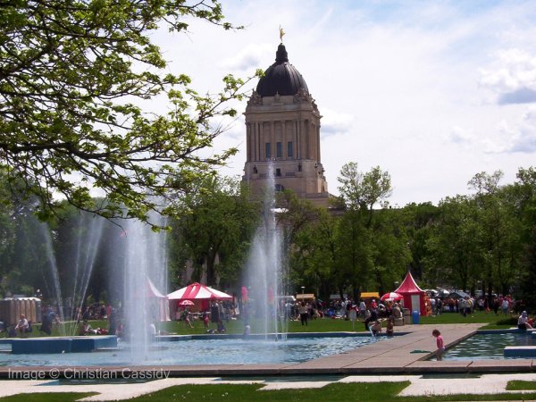 Memorial Park is Manitoba’s smallest provincial park located in downtown Winnipeg north of the Legislative Building. In 1961, the City of Winnipeg signed over to the province 4.5 acres of land it already owned along Memorial Boulevard. The province combined that with land that it owned, the original University of Manitoba campus, across from the Legislature. On 28 September 1962, the Park and City Hydro Fountain were dedicated by Premier Duff Roblin.