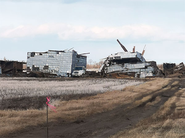 Former Manitoba Pool grain elevator at Mentmore being demolished (April 2021)