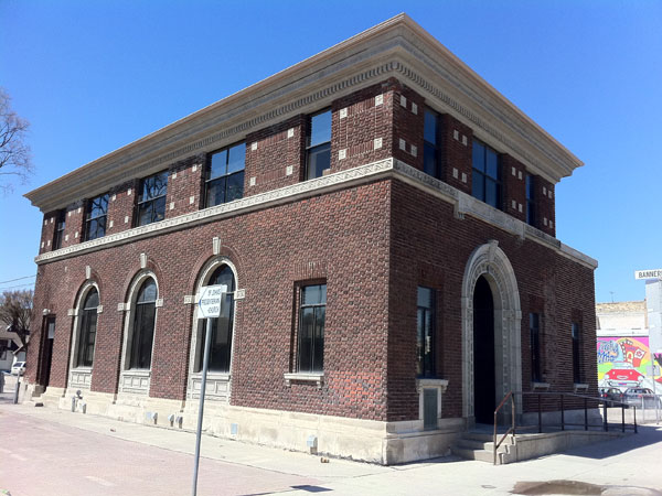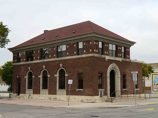 This two-storey red brick and Tyndall stone building at the northwest corner of Main Street and Bannerman Avenue in Winnipeg, measuring 31 feet by 65 feet, was designed by local architect John Danley Atchison. The contract was awarded to George Fuller Construction of New York and construction in 1913 consumed 23 cords of stone, 125,000 bricks, 1500 yards of plaster and 40 cubic yards of concrete, along with structural steel provided by the Manitoba Bridge and Iron Works. Completed at a cost of about $28,000, the building was intended as a branch of the Merchants Bank of Canada, with a residence for the bank manager on the second floor, to service the prosperous new suburb which was developing north of Redwood Avenue.