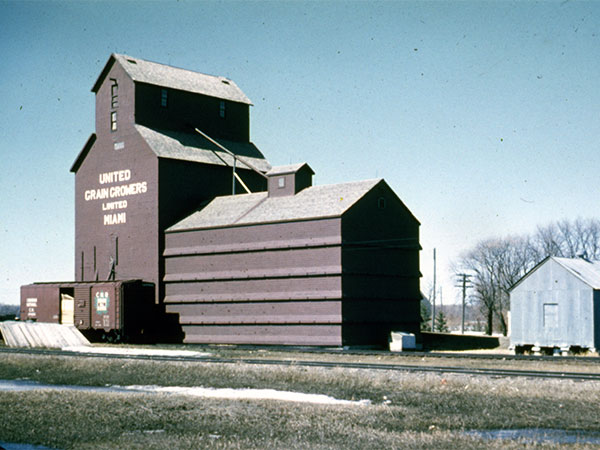 A wooden grain elevator in Miami, on the CNR Miami Subdivision in the Rural Municipality of Thompson, was built by the Miami Farmers Elevator Company in 1923. It was owned successively by the Canadian Consolidated Grain Company (1940-1959), United Grain Growers (1959-1970), Federal Grain (1970-1972), and Manitoba Pool Elevators (1972-1974). It was the Pool B elevator until being closed and removed around 1974.