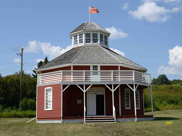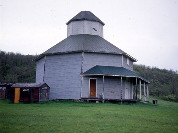 This wooden structure in the Town of Minnedosa was built in 1904 to provide space to display agricultural goods and products. It is one of the few remaining examples of Manitoba buildings erected on an octagonal plan that was popular between 1880 and 1910, especially in the United States. Now a provincially-designated historic site, the Display Building was moved in May 2007 from its former location on the Agricultural Society Fairgrounds to the Minnedosa and District Museum. Beginning in the following year, it underwent an extensive restoration, receiving new shingles, lap siding, and paint. The balcony and verandah were restored to those shown in the original plan, and new windows were installed. The interior was restored in 2009, permitting it to be used for display and the museum office.