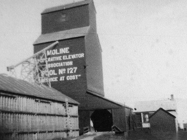 A wooden grain elevator at Moline, in what is now the Rural Municipality of Oakview on the former CNR Rapid City Subdivision, was built by United Grain Growers in 1913, one of the first elevators constructed by the company as opposed to being bought from others. Traded to Manitoba Pool Elevators around 1948, it closed in December 1978 when the adjacent rail line was abandoned. The building stood vacant until at least the early-1990s and was later removed from the site. Only its concrete foundation was visible during a 2016 site visit.