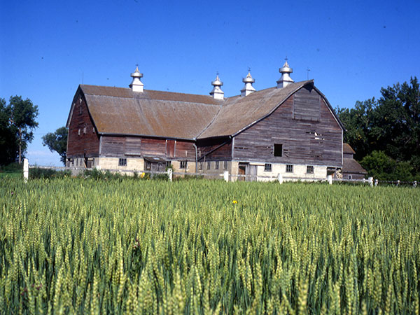 They don’t come much bigger or more handsome than this turn-of-the-century, L-shaped barn that straddles the Canada-US border near Snowflake. George Motheral left Plattesville, Ontario for Manitou in 1880. His son Isaac continued to Snowflake and began farming there in 1897. Three years later this large 80-foot by 80-foot barn was put up by friends and neighbours under the supervision of a master carpenter. The 12-inch square beams had been cut and milled near Altamont and then skidded across nearly 25 miles of snow-covered fields and roads. This massive system of beams was mortised and pegged, with the square nails used only in exterior sheeting. In its day, the Motheral barn was considered one of the biggest and most modern in the area. With 32 horses working the fields in teams, and another 30 or more head of stock in the main barn, the large loft was called upon to shelter sufficient feed for an entire winter, including 6,000 bales. The loft had an Ontario-style earth ramp to allow full wagons into the upper area. The lower level featured individual stalls for livestock, as well as front and rear passageways, for cleaning and water in front of each animal. A 40-foot by 24-foot pig barn was also built on the north (right) side of the barn. One of the features of the main barn that still attracts visitors along Highway No. 242 is the four large gleaming cupolas that have not required paint since being installed nearly 80 years ago. As part of the “King Ventilating System,” these enormous cupolas were at one time attached to ventilating shafts that served more than 14,000 square feet of floor space. They were later disconnected because of interference with the hay mows. In 1933, Isaac’s sons Ralph and Lloyd took over the Motheral farm and, in 1968, Wayne took over from his uncle and father Ralph.