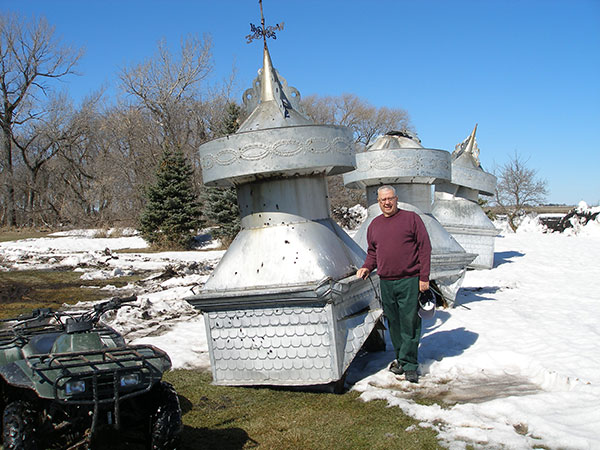 Former barn owner Wayne Motheral beside metal cupolas from the barn (no date)