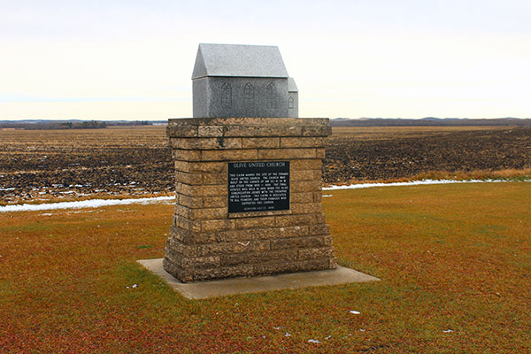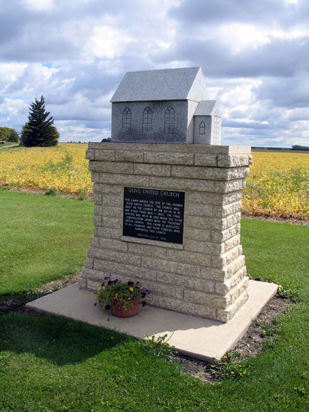 This monument, dedicated on 23 July 2000, marks the site of the former Olive United Church. The church was built on the corner of the northwest quarter of 22-8-10 west of the Principal Meridian, in the Rural Municipality of South Norfolk, and stood from 1899 to 1999. It took its name from that of the surrounding district, which is said to have been named for Mary Olive Kelly (1845-1934), wife of area pioneer Robert James Warren.