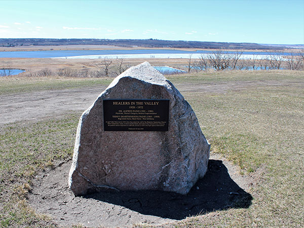 A monument beside Highway 23, overlooking Pelican Lake in the Rural Municipality of Prairie Lakes, was dedicated on 10 June 2005 to the memory of Dr. Alfred Paine and his wife Theodis “Teddy” Marteinsson Paine (1905-1999). In 1928, they met at the Ninette Sanatorium where he worked as a physician and surgeon and she was a registered nurse in the fight against tuberculosis.