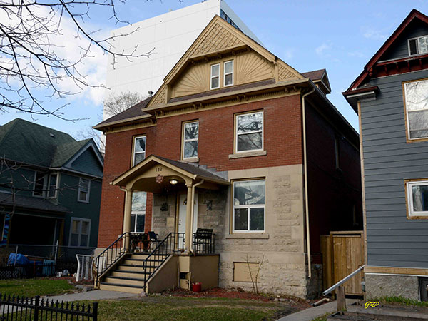 This two-storey brick and stone house on Spence Street in Winnipeg, measuring 34 feet by 34 feet, was designed by William Arthur Irish and built in 1904 by W. A. Irish and Company at a cost of about $6,000. Its first occupants were businessman John Hamilton Parkhill and his family. They lived here into the 1930s.