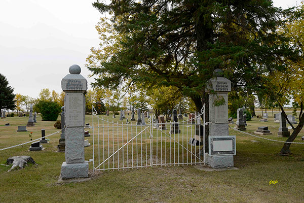 Plaques on the gateposts into this cemetery, near Pierson in the Municipality of Two Borders, commemorated local residents killed during military service. Dedicated at a ceremony on 3 August 1931, there were missing at the time of a July 2025 site visit.