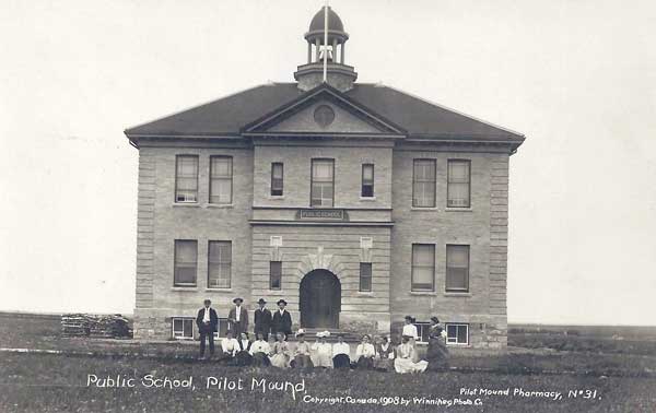 The Pilot Mound School District was established formally in November 1880, in the Village of Pilot Mound. A two-storey wood frame structure, known as the “Old Red School,” continued to be used after a two-storey brick school building was erected nearby in 1905, using locally-manufactured bricks, on a design by Winnipeg architect J. H. G. Russell. The brick school was demolished in 1959. It was replaced by a building that, in the 1960s, became Pilot Mound Consolidated School when it was consolidated with rural schools from the surrounding vicinity: Goudney School No. 87, Gowancroft School No. 204, Marringhurst School No. 231, Pembina School No. 270, Wood Bay School No. 307, Floral School No. 397, Copperfield School No. 480, and Stuartville School No. 795.