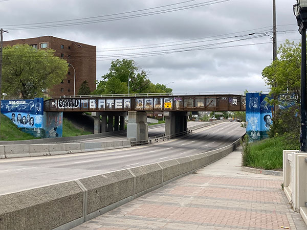 The single-span bridge had a single track to accommodate the Canadian Pacific Railway while the roadway originally had two lanes measuring 24 feet for automobile traffic on ether side and 24 feet in the middle to accommodate two tracks for the Winnipeg Electric Company’s streetcars but these were removed after the system was decommissioned in 1955.