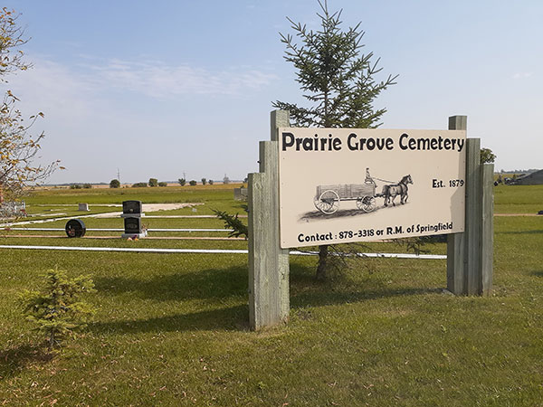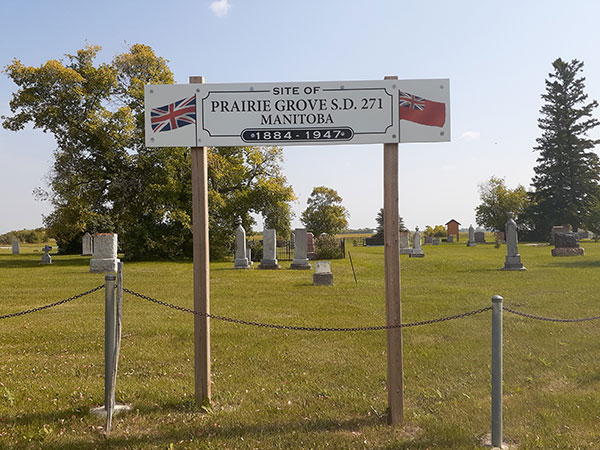 The Prairie Grove School District was established in March 1885 and a one-room schoolhouse operated at this site in the Rural Municipality of Tache until 1947 when a new building replaced it on a site a short distance to the northwest. A cemetery, established in 1879, is also situated here. Its operations are overseen by the Rural Municipality of Springfield.
