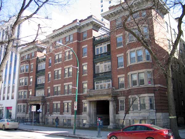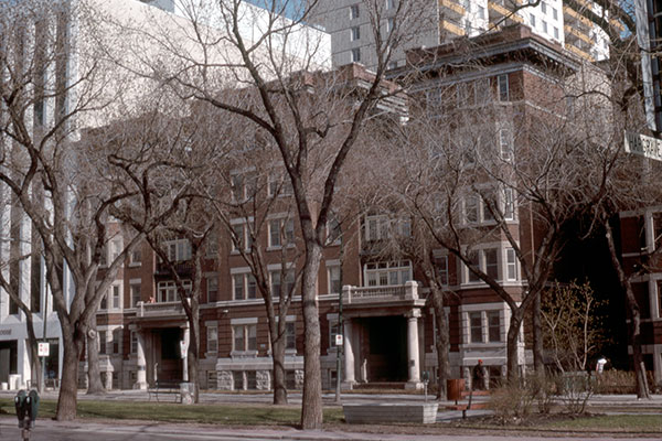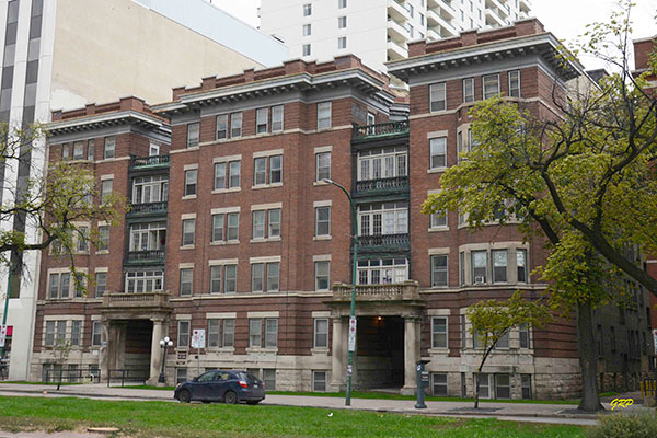 This five storey, brick and stone apartment block on the south side of Broadway in Winnipeg was designed by local architect William Wallace Blair and constructed in 1909, at a cost of about $200,000, for the Kenmore Apartment Company. The 120 foot by 115 foot structure contained 55 apartments in its original configuration. Known as the Kenmore Apartments, its tenants included managers, professionals and workers employed in nearby businesses, hotels, stores, and railway facilities.