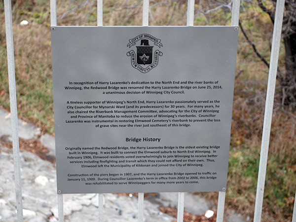 “Winnipeg’s Redwood bridge renamed for Harry Lazarenko,” CBC News, 3 October 2014.