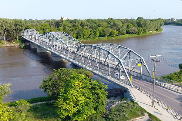 Built in 1907-1908, this steel through truss bridge over the Red River remains the oldest surviving bridge in Winnipeg. Conceptualized in August 1906 as a four-pier, 36-foot wide roadway, with two 6-foot wide sidewalks, the specifications would undergo changes prior to tendering, with city engineer Henry Ruttan playing a lead role. Site surveying was completed in November 1906 and the eastern approach to the bridge was donated by William Hespeler, where later the timber-reinforced ramp would be built at a cost of around $350. With no objections raised by a Dominion Government engineer during a bridge site visit on 10 January 1907, sub-structure work began under the contracting firm of Kelly & Sons of Kenora, Ontario. Work continued for three months before it was realized the project lacked the approval of the Federal Minister of Marine. With expenditures of over $10,000 on an unapproved project, construction was halted by the Board of Control. This early attempt also made no plans for how to combat the seasonal ice flows and failed to adequately accommodate river traffic, a concern voiced by steamboat operators and owners.