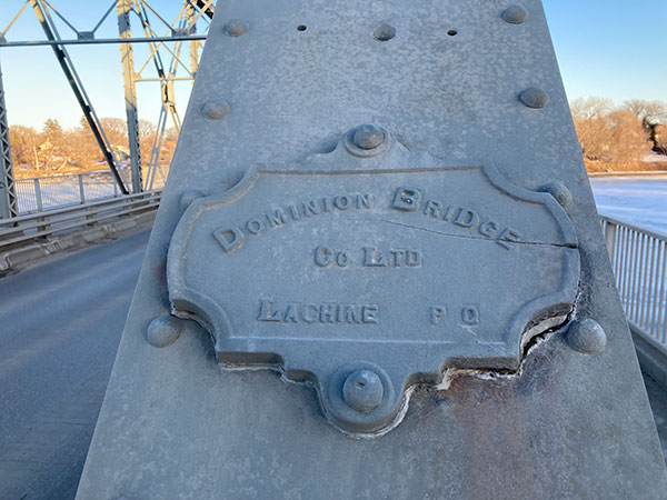 The entire length is comprised of two 150-foot spans, a shorter 98-foot span, and a central 250-foot swing span. Built with 700 tons of reinforced steel, it featured a 25-foot wide roadway flanked with six-foot wide sidewalks, and a mid-river swing span. Intended to be powered by electricity, a temporary 50-horsepower gasoline engine was settled on. To safeguard the structure against ice flows, an accompanying permanent icebreaker (then known as a fender) was built during the winter of 1912-1913. By 1947, it required an overhaul, having slowly been worn down over its year of service. It was again restored in 1979, at which time the restored protective measure was enlarged and reinforced further.