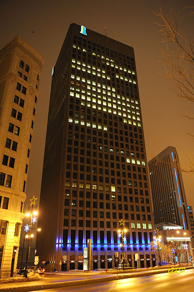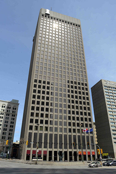This 34-storey (407 feet tall) building at the corner of Portage Avenue and Main Street in Winnipeg, measuring 137 feet by 137 feet, was designed by the architectural firm of Smith Carter Searle and Associates and constructed between 1967 and 1969 by Poole Construction using structural steel provided by Dominion Bridge. Four elevators served the lower 17 floors while six elevators served the upper levels. It was the city's tallest building until 1990 when a 33-storey office tower at 201 Portage Avenue was opened.