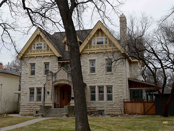 This two-storey stone structure in the Armstrong’s Point area of Winnipeg was designed by local architect Charles S. Bridgman and constructed in 1909 for Robert T. Riley.