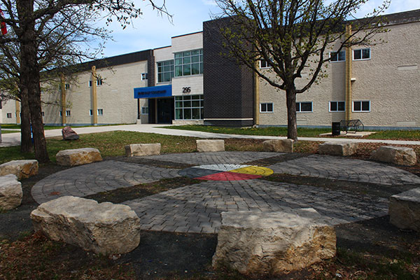 Entrance to River East Collegiate with commemorative monument