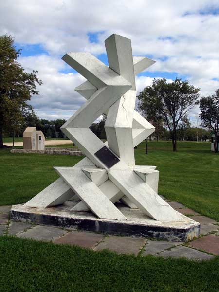 An abstract monument commemorates the pioneers of the Riverton district, who arrived here between 1875 and 1900. It is a symmetrical structure with three intertwined shapes representing the past, the present, and the future.