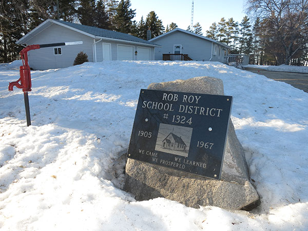 The Rob Roy School District was established in December 1904 and a one-room schoolhouse was constructed at SE16-13-7W in the Rural Municipality of Portage la Prairie. Initially heated by wood or coal, the furnace was replaced with an oil burner in 1950. A shelterbelt of trees around the building was planted in 1940 and electric lights were installed in 1949. The district was dissolved in 1967 and the land became part of the Portage la Prairie School Division. A commemorative monument stands at the former school site.