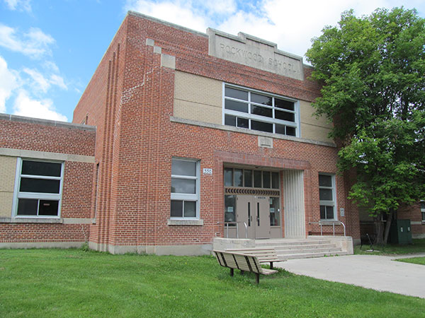A sod-breaking ceremony for Rockwood School, a facility of the Winnipeg School Division, was held on 25 April 1949 with trustee Mrs. D. A. P. McKay performing the honours. The cornerstone was laid by trustee Stanley B. Laing on 17 February 1950 at an event attended by former and present school board chairs G. P. MacLeod and Campbell Haig. Inside the cornerstone were lists of federal, provincial, city, and school officials, along with school reports, coins, and newspapers.