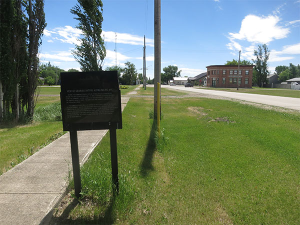 Commemorative plaque for the United Grain Growers grain elevator at Roland, with the 4H Museum in the background (June 2017)