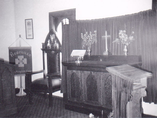 In 1884, a 16- by 24-foot church was built at this site in the Municipality of Riverdale, on land donated by James Varcoe, using materials hauled from Brandon. Varcoe also constructed the original pulpit and pews. The first service was held in it on 13 April 1884. Due to the small population of any one denomination in the area, Roseville operated as a Union Church and services were offered by Baptist, Episcopal, Methodist (later United), Congregational, and Anglican clerics in rotation. Later services were provided only by United and Anglican clerics until only the Anglican church was providing service.