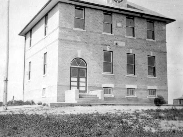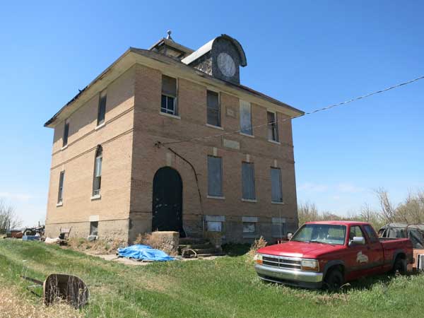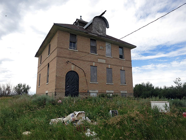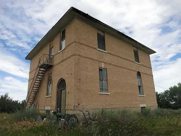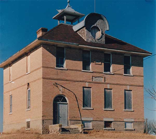 Commonly identified as Two Creeks School due to its proximity to the Canadian Pacific Railway siding of Two Creeks, this school building in what is now the Rural Municipality of Wallace-Woodworth sat atop a small hill that gave it a commanding view of the landscape in all directions. The two-storey, two-classroom brick building was initially known as Kyle School No. 1782 when it was built in early 1915 using yellow bricks made at Virden. Soon after, it was renamed Ross Consolidated School when consolidated with Ross School No. 504 (which had operated since 1887 at SE33-12-26W).